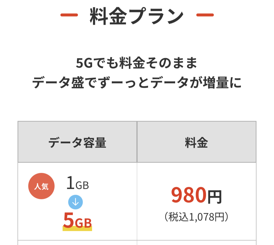価格帯としても最安プランがデータ盛なしで1GB980円ですので、最安というほどではありませんが廉価帯の格安SIMと言えます。