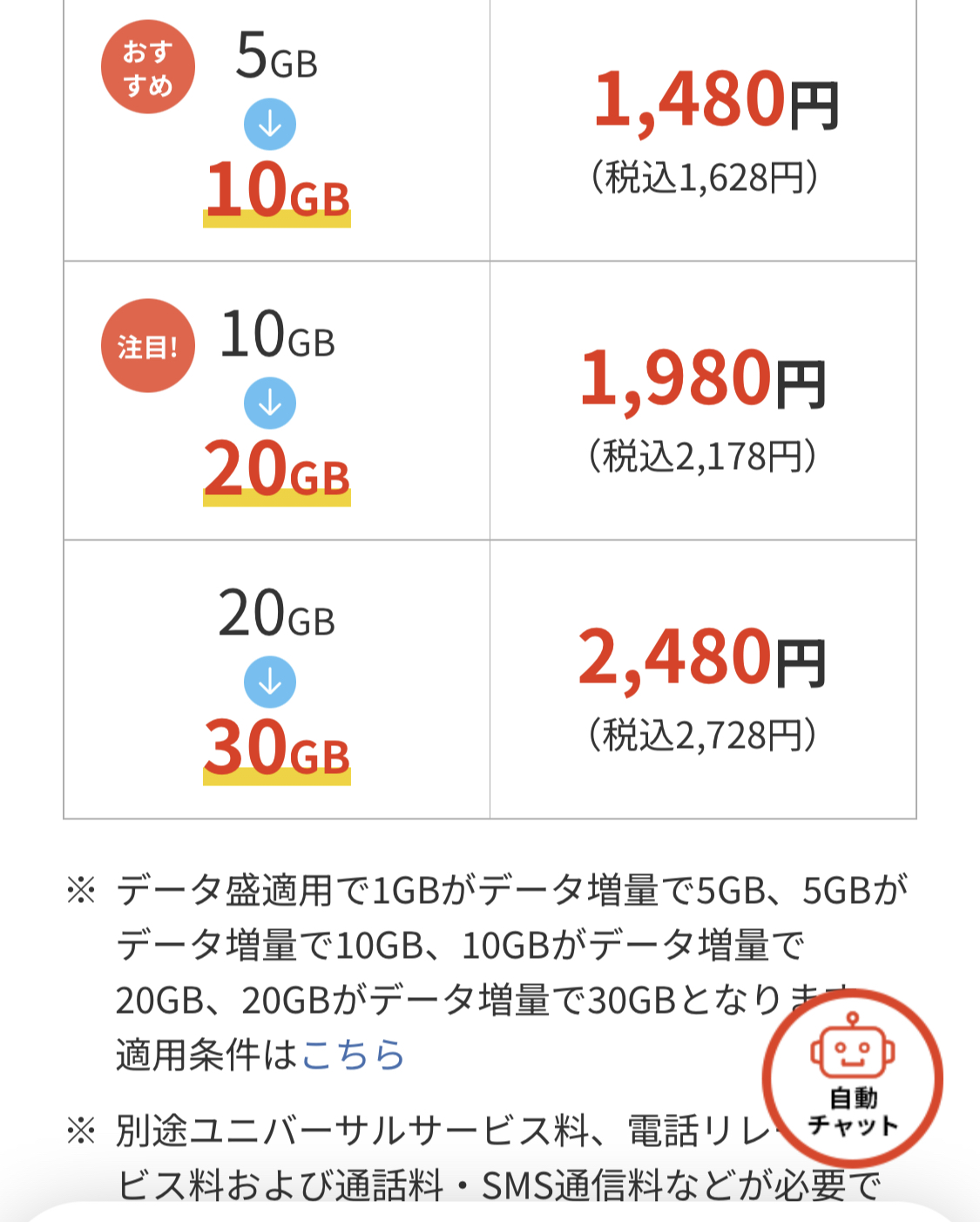 JCOMモバイルの他社にはない特徴と言えば、何といっても「データ盛」です。これはJCOMのモバイル回線以外のサービス、電気・ケーブルテレビ・ネット・固定電話を契約していると自動に適用されるサービスで、例えば1GBプランだと月額料金は980円のままでデータ容量が毎月5GBに増量されます。